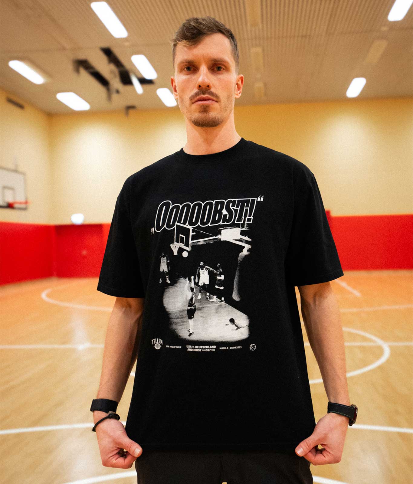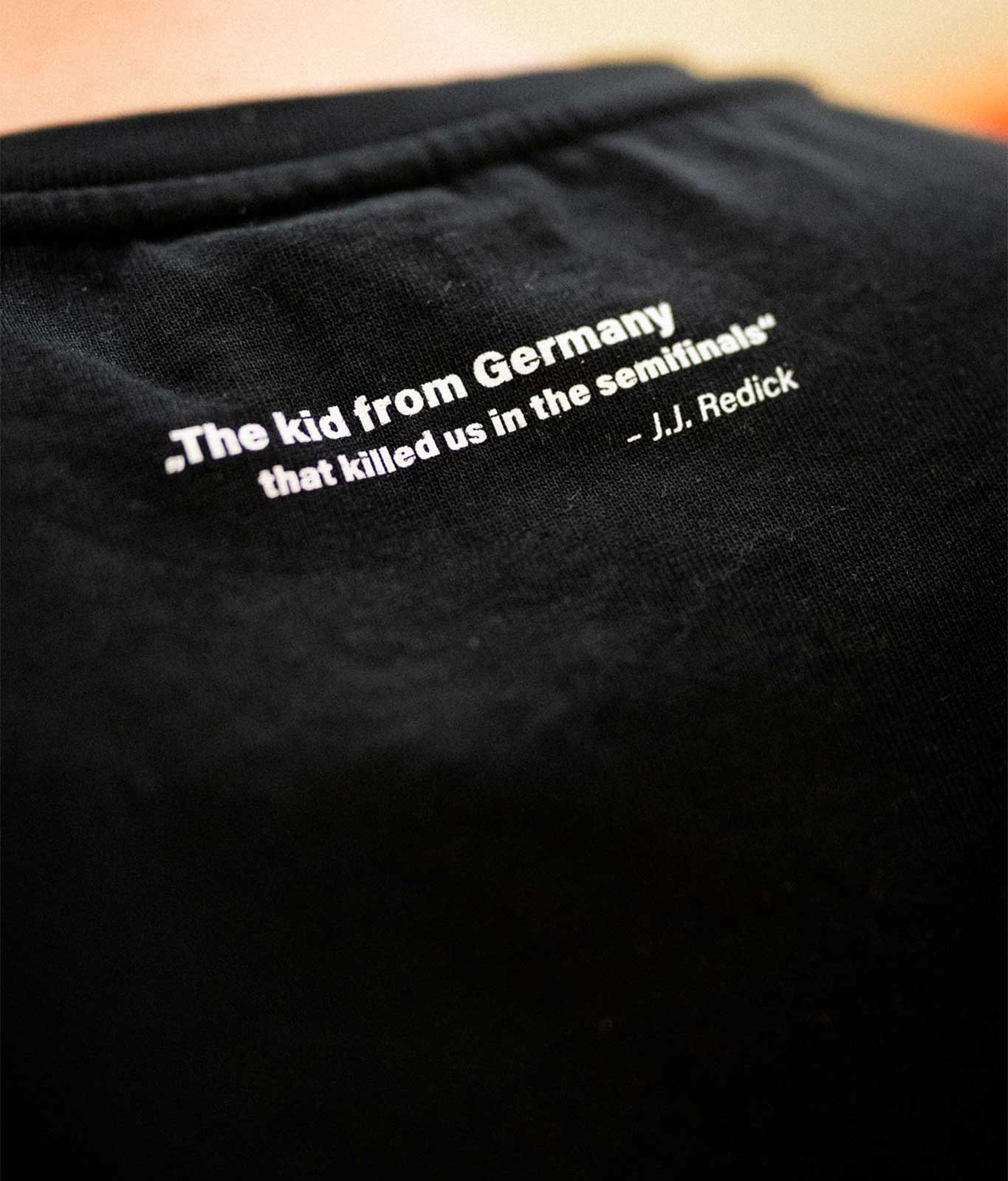 Gemeinsam mit Basketball-Nationalspieler Andi Obst haben wir seinen Wurf zum 111:107 gegen die USA im WM-Halbfinale auf einem T-Shirt verewigt. Abgerundet wird das Design mit einem Zitat von dem ehemaligen NBA-Star J.J. Redick, der in einem Podcast anerkennend sagte: "The kid from Germany that killed us in the semifinals"