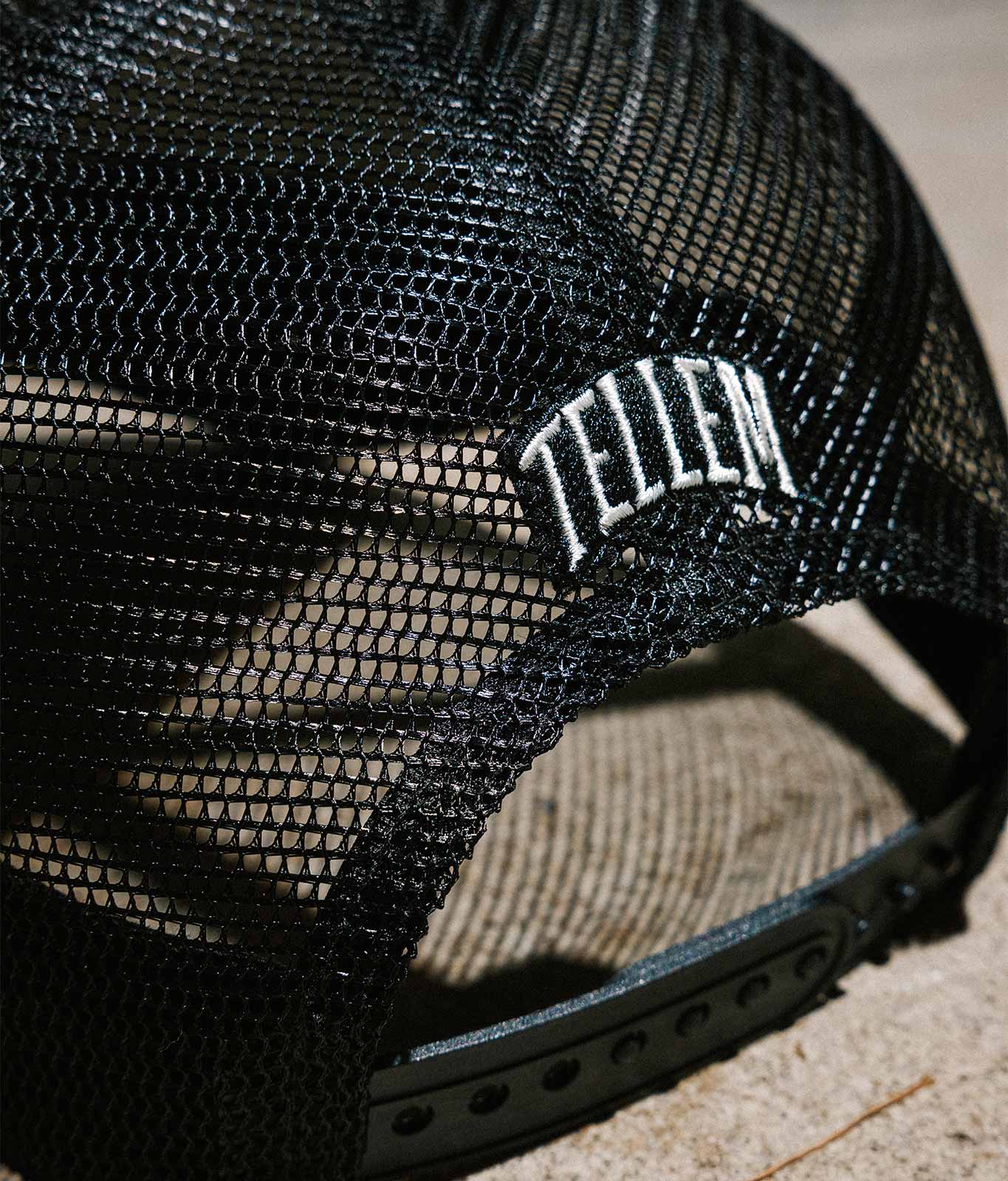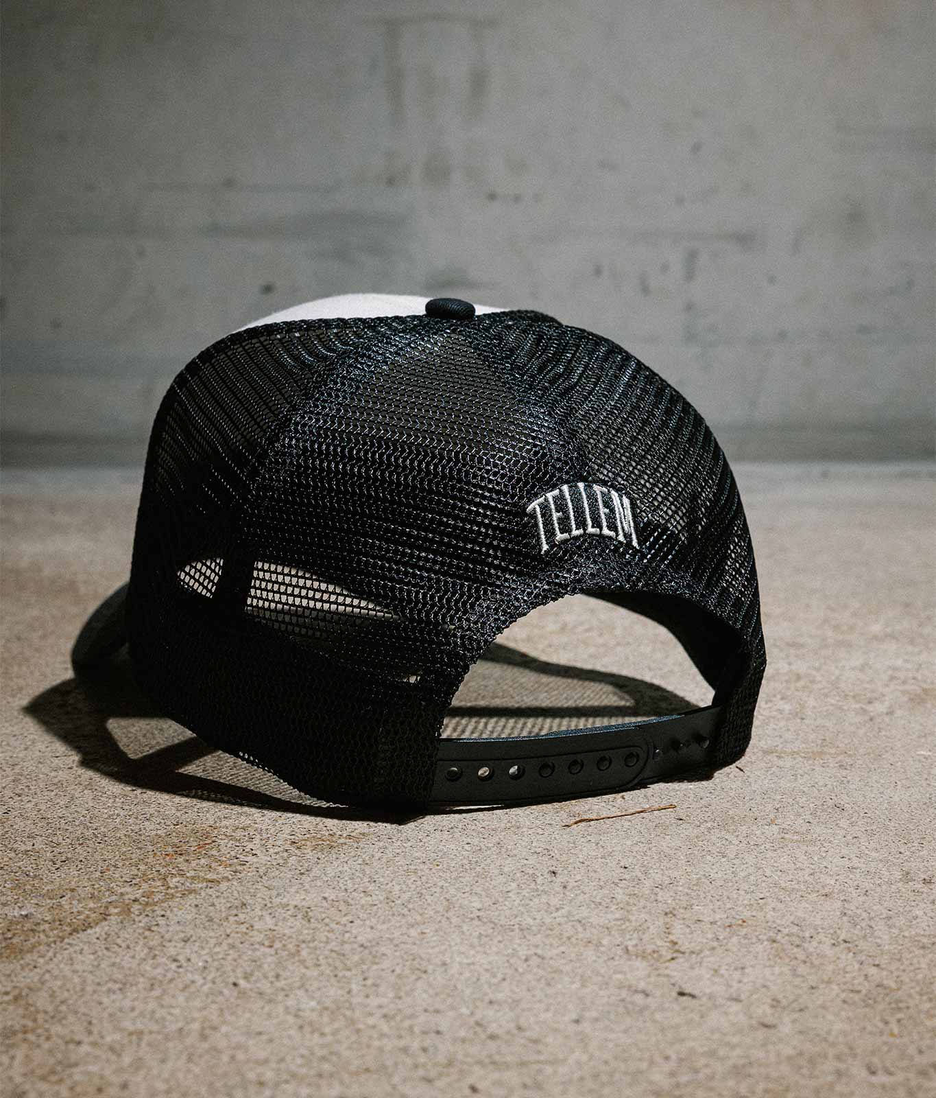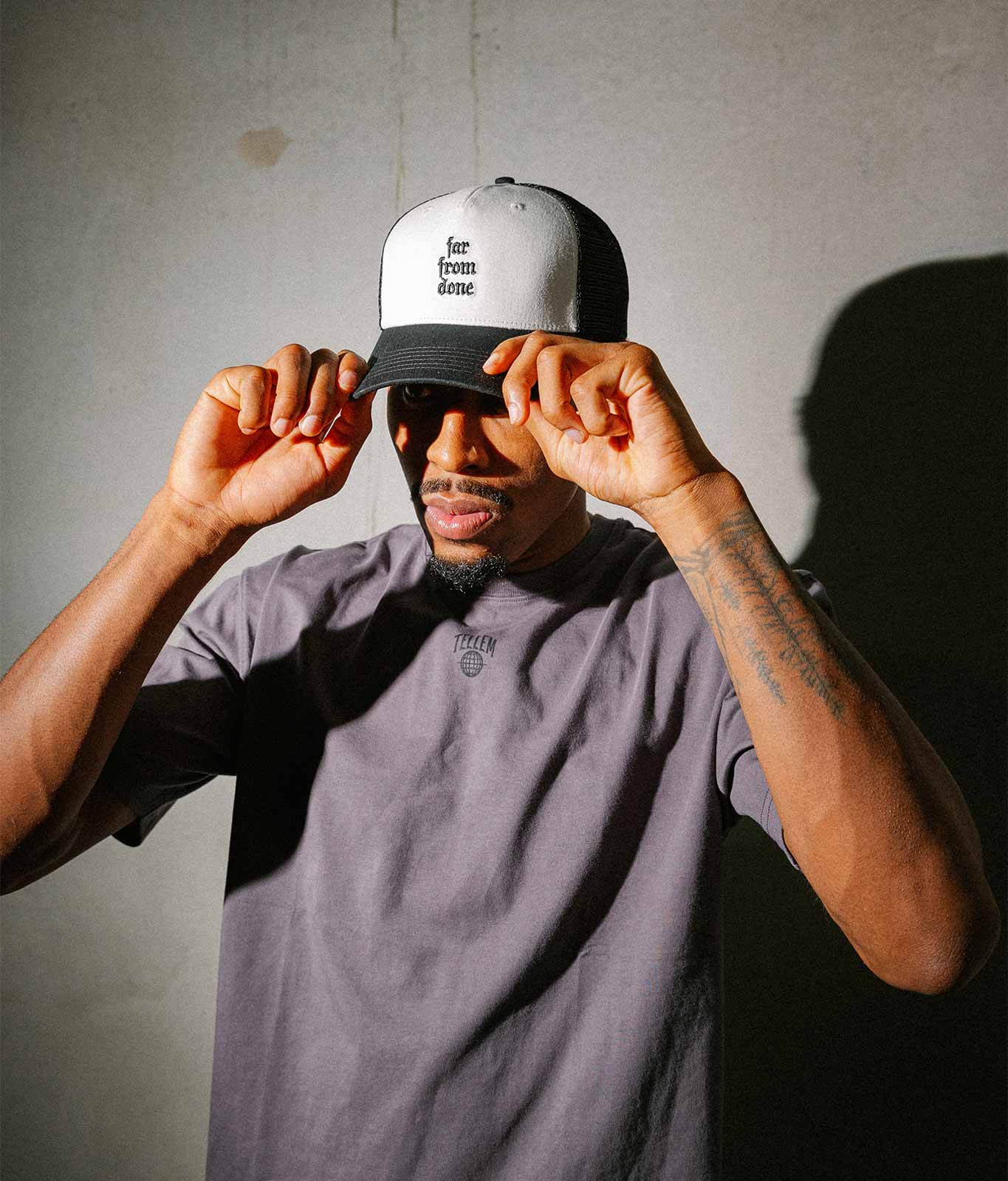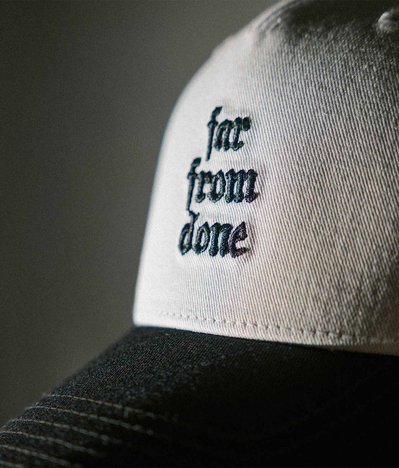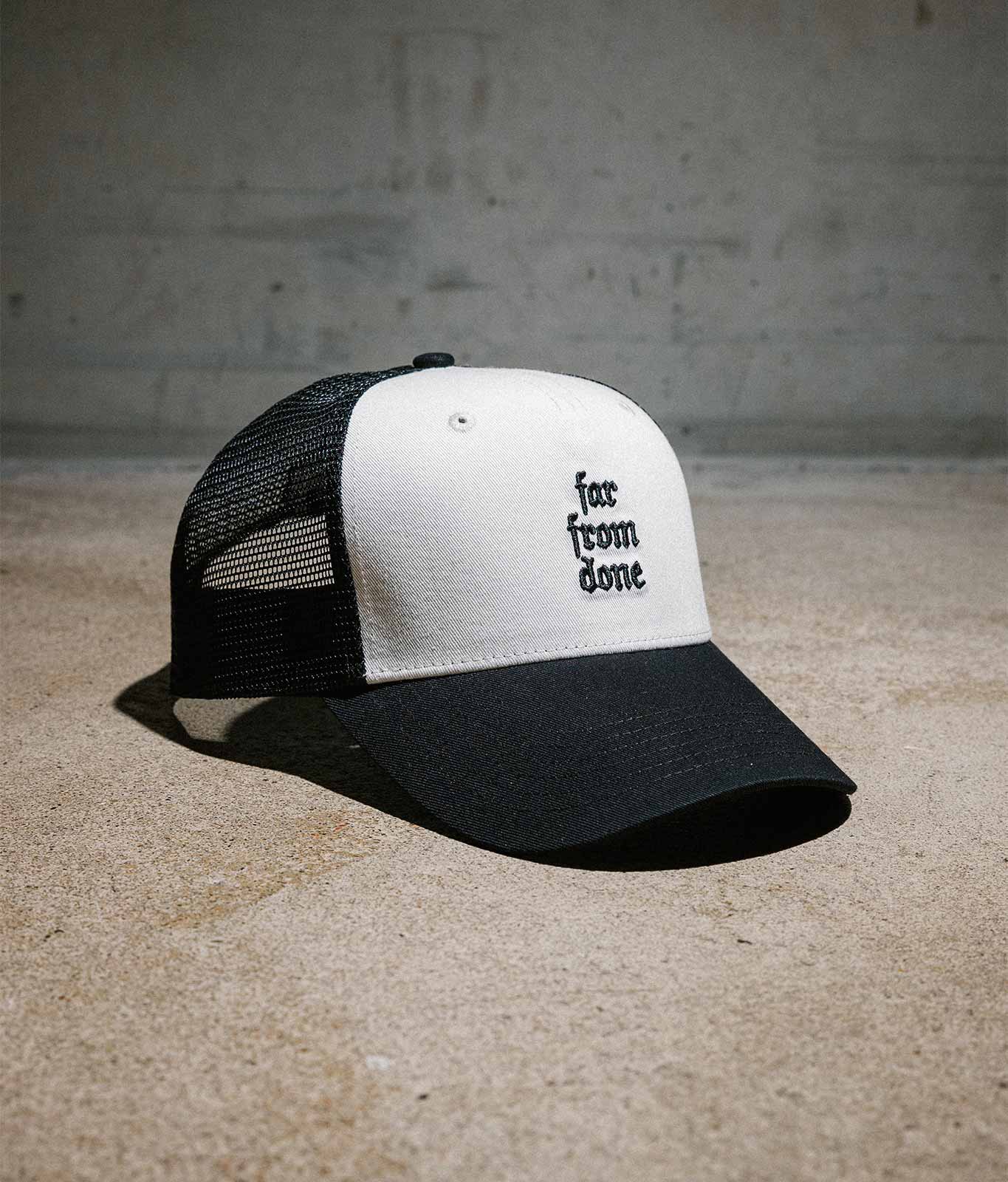 Auf der weißen Front der Trucker Cap ist die Message "Far from done" in schwarz aufgestickt. Die hinteren Panels sind schwarz und aus Mesh, ergänzend zu den hellen Frontpanels. Hinten, über dem Snap-Verschluss, ist dezent "Tellem" in flach aufgestickt.