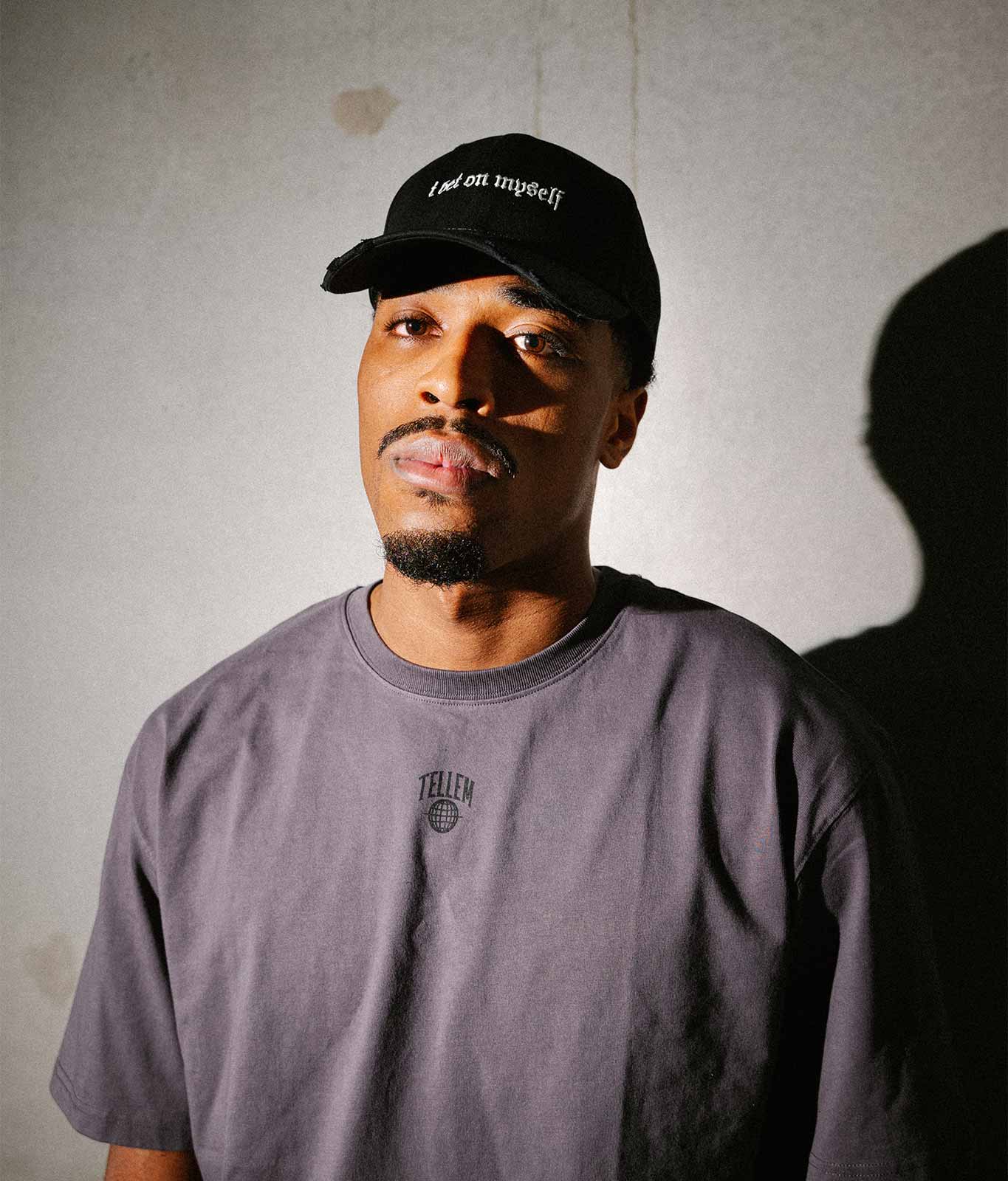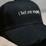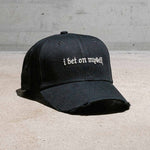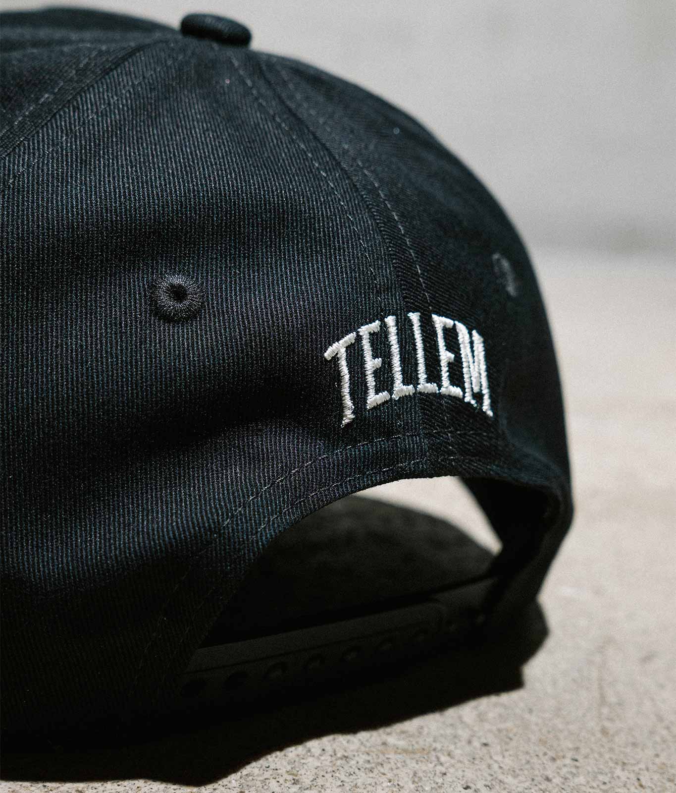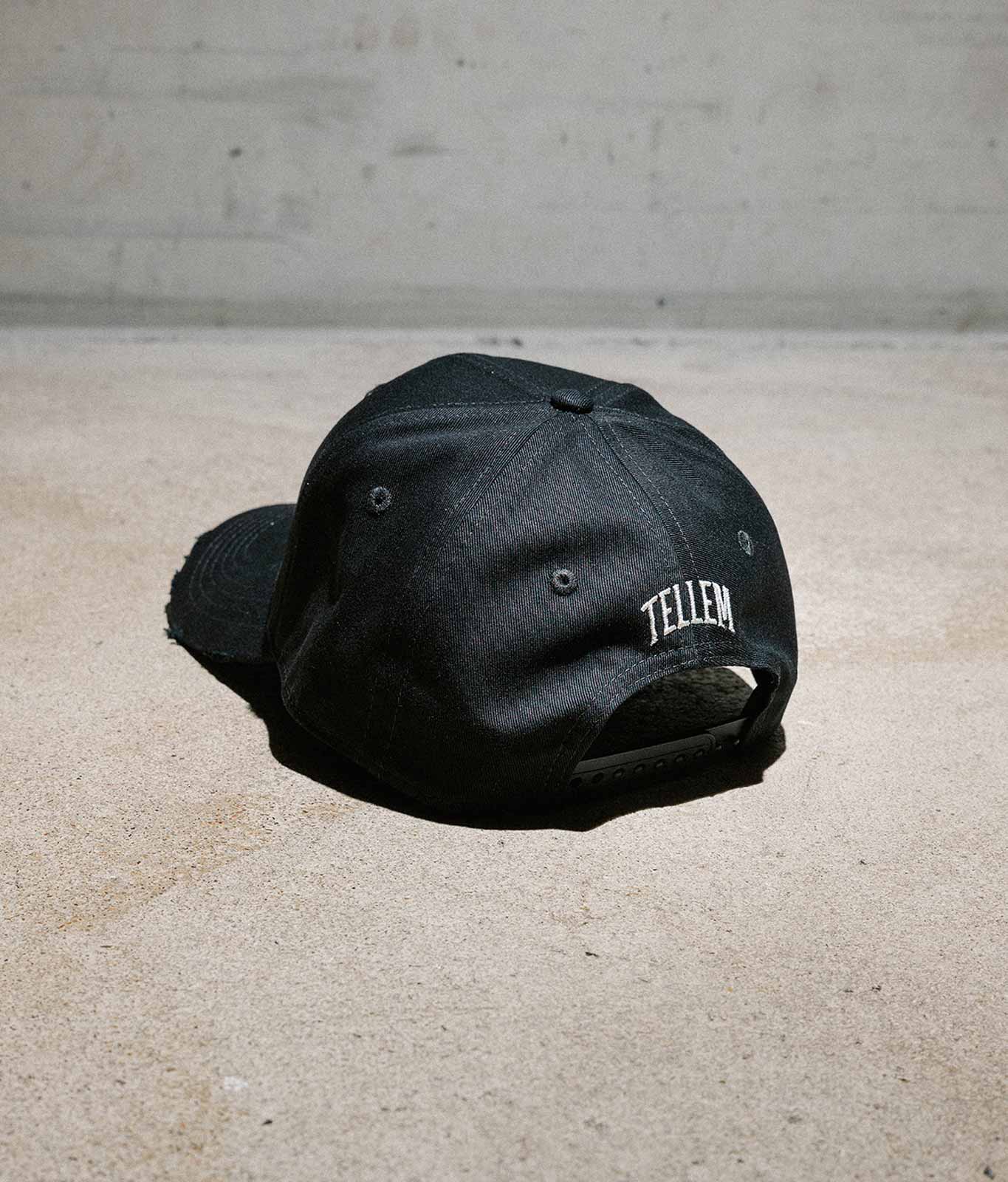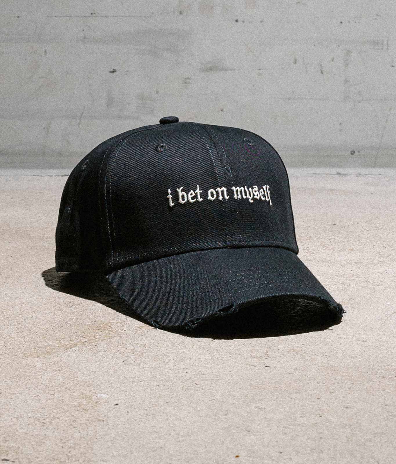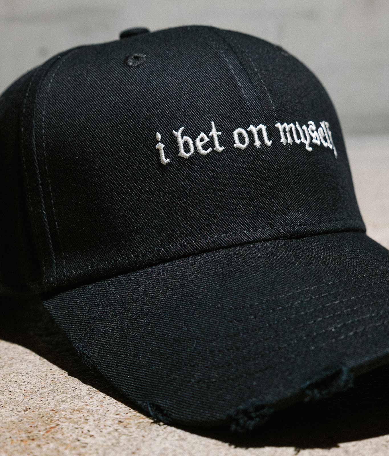 Auf der Front der schwarzen Basecap ist die Message "I bet on myself" aufgestickt. Das Design wird mit dem Schirm im Distressed-Look abgerundet – ein besonderes Highlight. Hinten, über dem Snap-Verschluss, ist dezent "Tellem" in flach aufgestickt.
