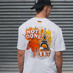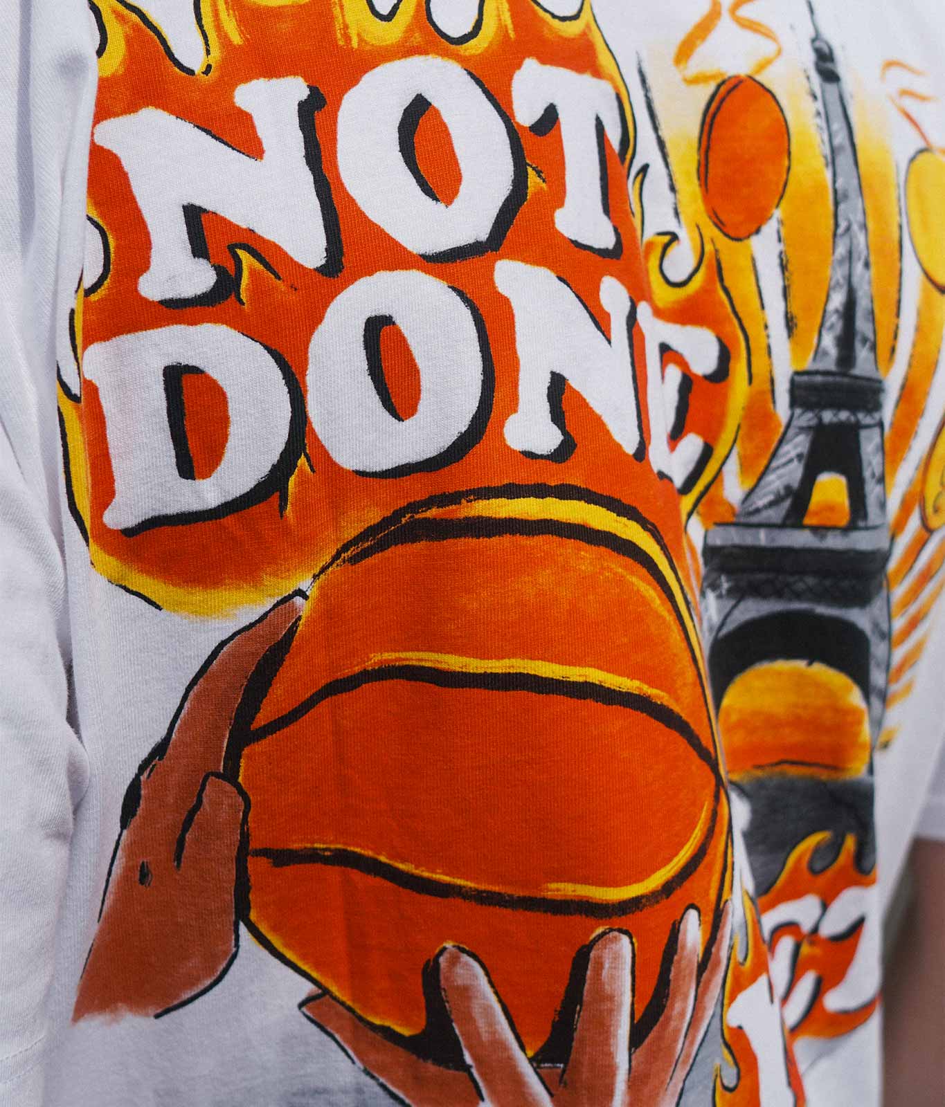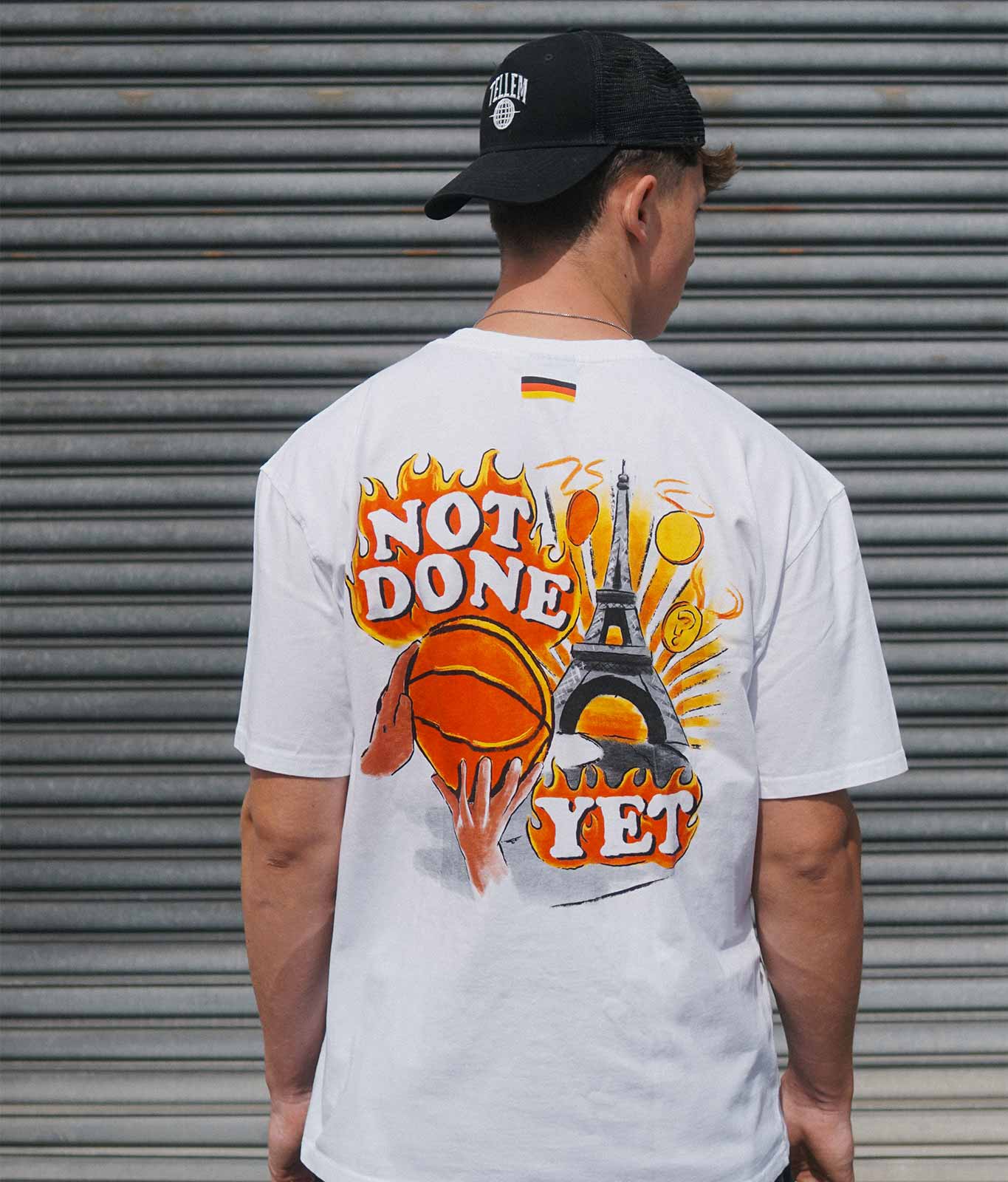 Drei Jahre in einem Design – Wir haben es uns zur Aufgabe gemacht, diese drei Jahre in einem Design festzuhalten, was für die Ewigkeit bestehen soll. Der Backprint auf dem 220g/m² kräftigen weißen T-Shirt besteht aus der Message "Not done yet", sowie den Details mit den Medaillen, den Flammen die das Olympische Feuer repräsentieren und der "Road to Paris".