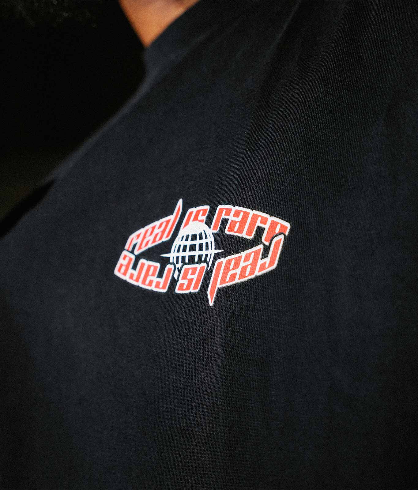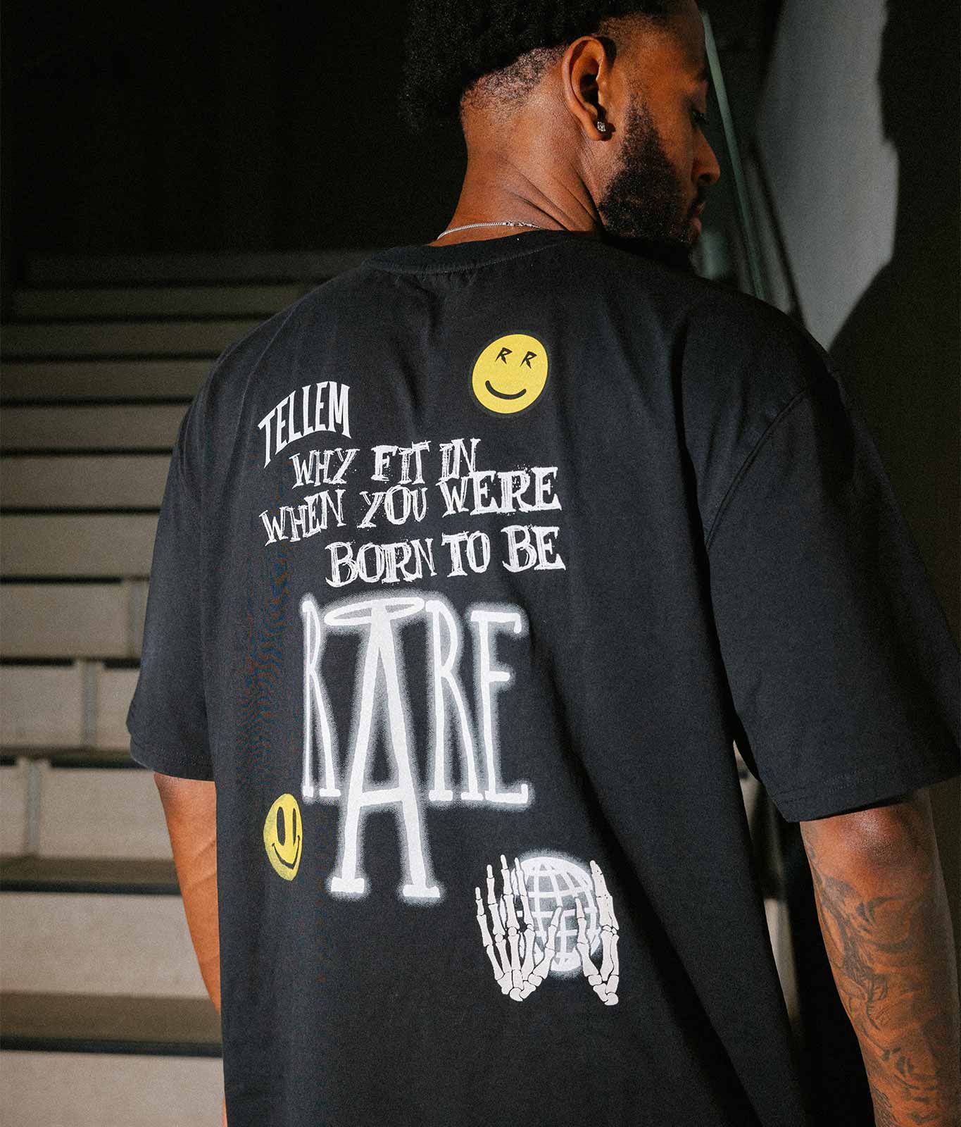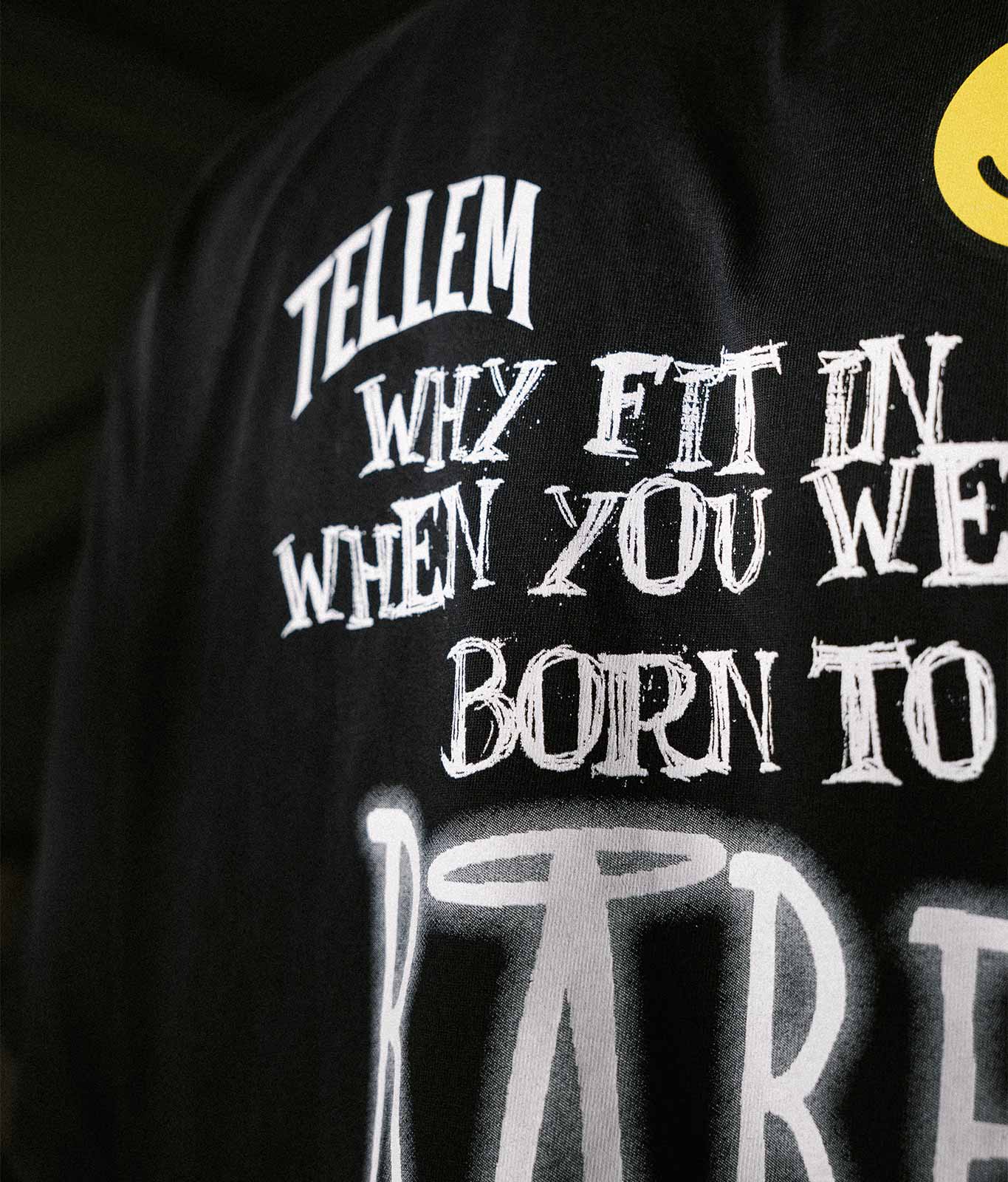 Das Design – Einige Monate später, im Mai 2024, ist das T-Shirt fertig! Wir haben viel Kreativität und Personality in das Design gesteckt. Beginnend mit dem Frontprint, der beide Logos vereint. Hier schwingt sich um den Tellem Globe der Brand-Name "Real is rare". Im Backprint findet ihr beide Logos, die jeweiligen individuellen Smileys aus unseren beiden Brands, sowie eine starke Message – Why fit in when you were born to be rare!