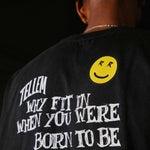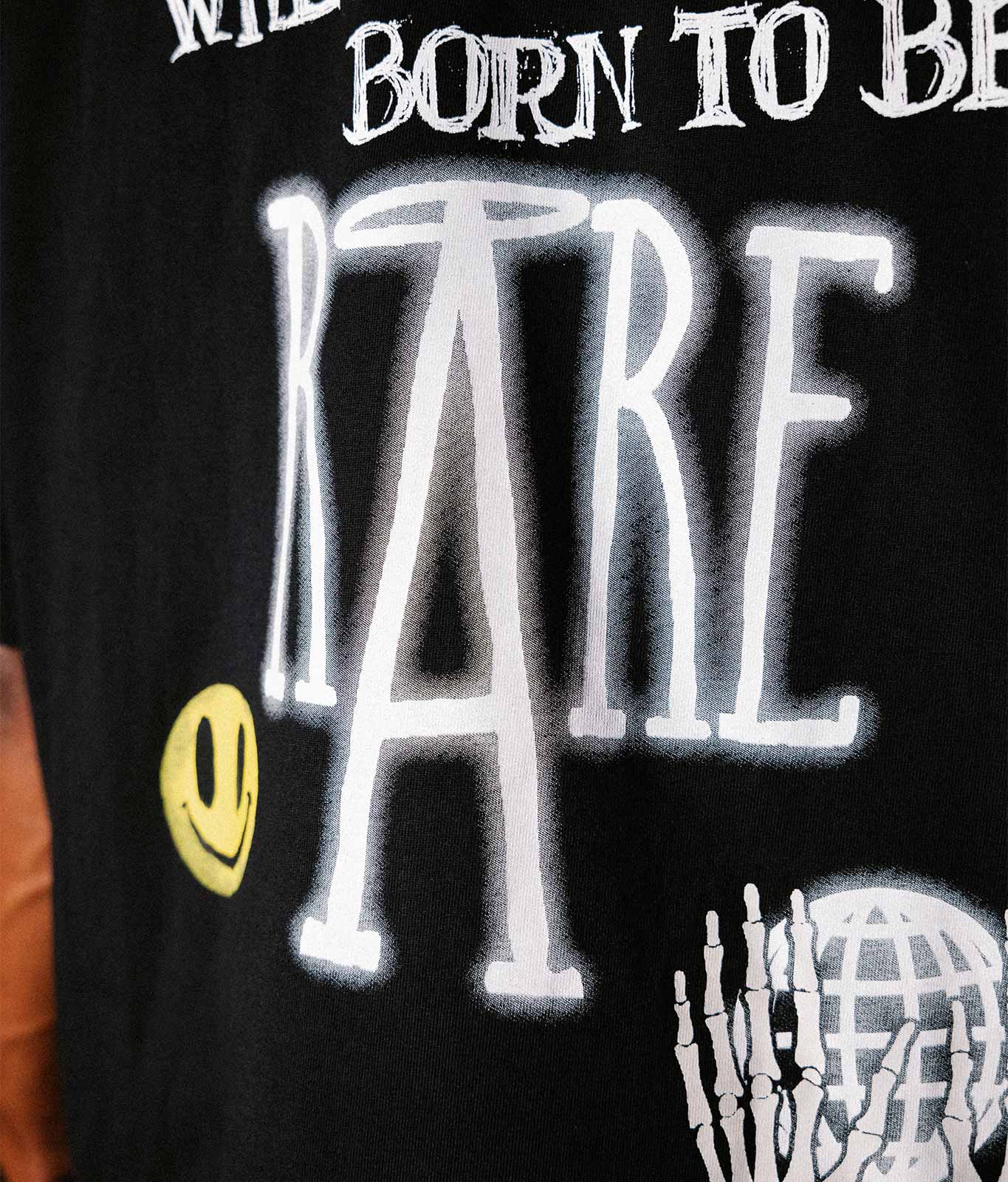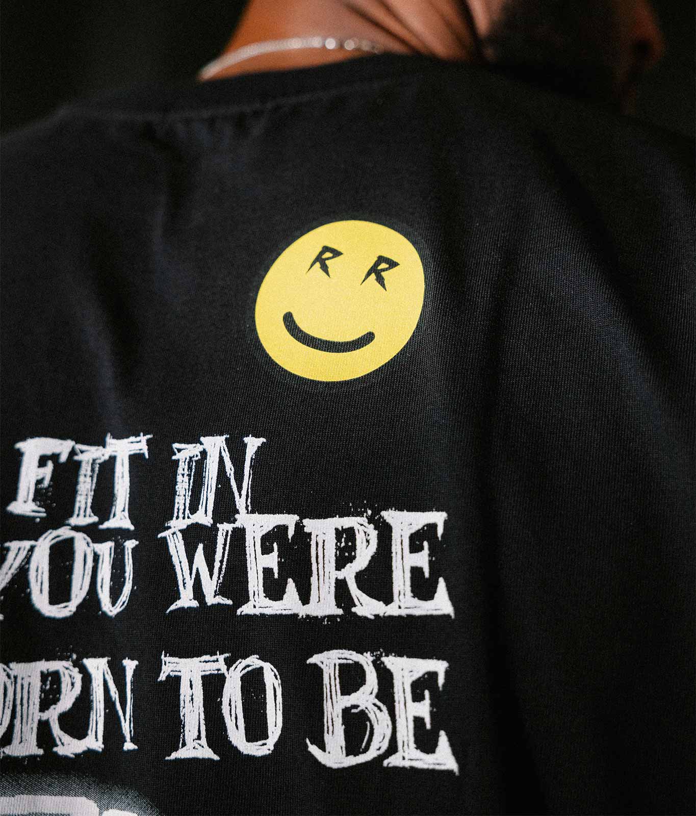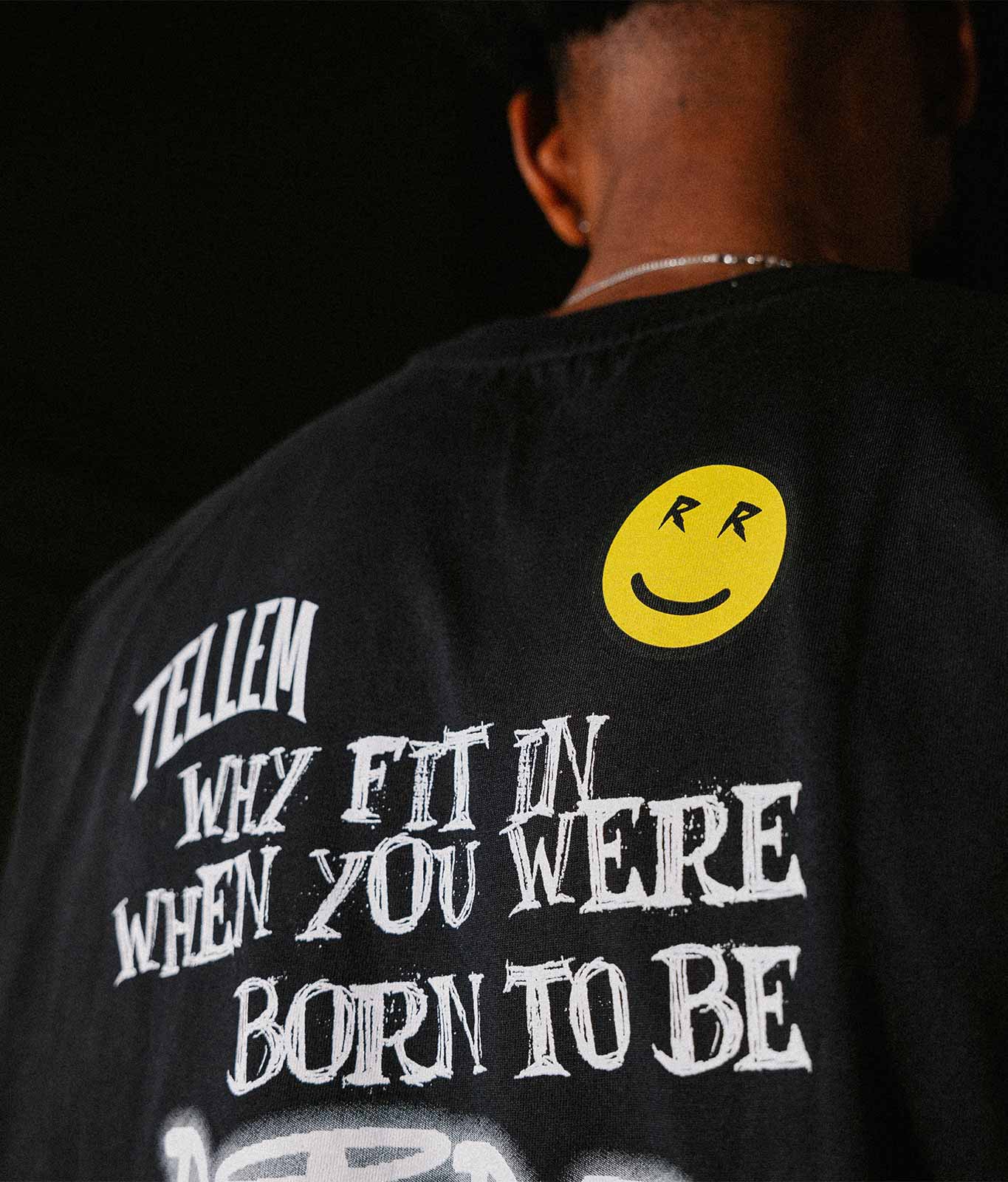 Das Design – Einige Monate später, im Mai 2024, ist das T-Shirt fertig! Wir haben viel Kreativität und Personality in das Design gesteckt. Beginnend mit dem Frontprint, der beide Logos vereint. Hier schwingt sich um den Tellem Globe der Brand-Name "Real is rare". Im Backprint findet ihr beide Logos, die jeweiligen individuellen Smileys aus unseren beiden Brands, sowie eine starke Message – Why fit in when you were born to be rare!