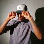 Auf der weißen Front der Trucker Cap ist die Message "Far from done" in schwarz aufgestickt. Die hinteren Panels sind schwarz und aus Mesh, ergänzend zu den hellen Frontpanels. Hinten, über dem Snap-Verschluss, ist dezent "Tellem" in flach aufgestickt.