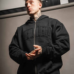 • Reißverschluss, lockerer Fit, lässige Schultern, starke Kapuze, zwei Taschen auf der Vorderseite